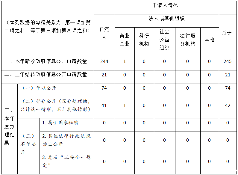 编制说明:本报告是根据《中华人民共和国政府信息公开条例》(国务院令第711号)和国务院办公厅政府信息与政务公开办公室《关于政府信息公开工作年度报告有关事项的通知》(国办公开办函〔2019〕60号)要求编制。全文包含总体情况、行政机关主动公开政府信息情况、行政机关收到和处理政府信息公开申请情况、因政府信息公开工作被申请行政复议、提起行政诉讼情况、政府信息公开工作存在的主要问题及改进情况、其他需要报告的事项六个方面。