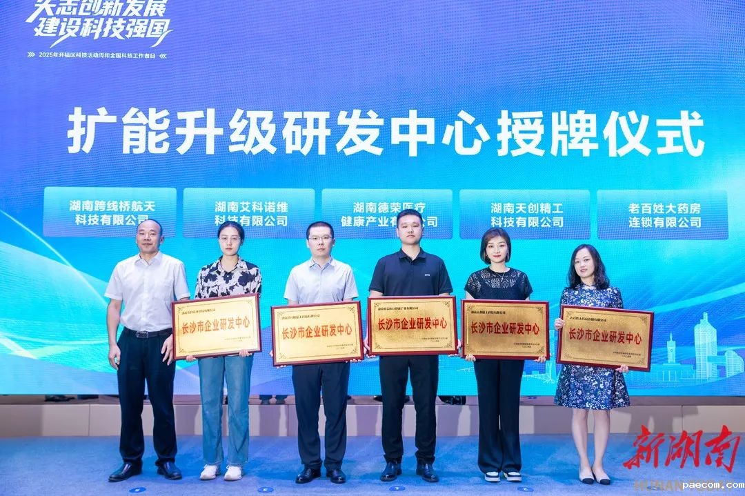 授牌仪式上,长沙市科技局党组成员、副局长罗强为湖南跨线桥航天科技有限公司、湖南艾科诺维科技有限公司、湖南德荣医疗健康产业有限公司、湖南天创精工科技有限公司及老百姓大药房连锁有限公司5家获评“长沙市扩能升级企业研发中心”的企业授牌,此举旨在鼓励企业加大研发投入,提升自主创新能力,推动科技成果转化。